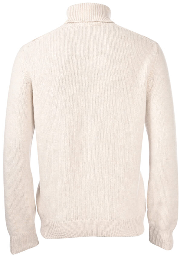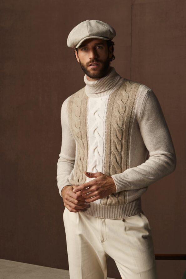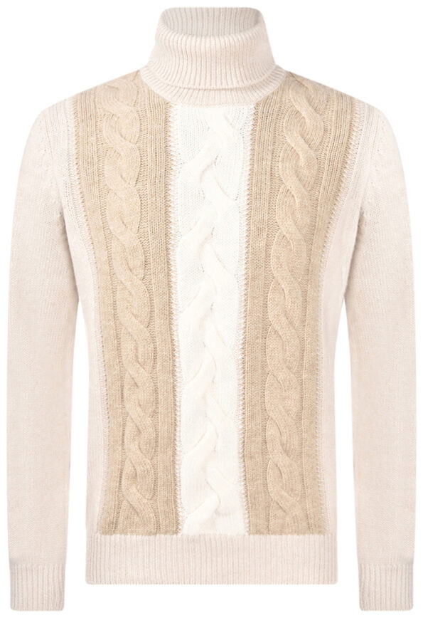 Dolcevita in lana Super Geelong a 3 fili con lavorazione a trecce e intarsio in contrasto colore sulla parte frontale.