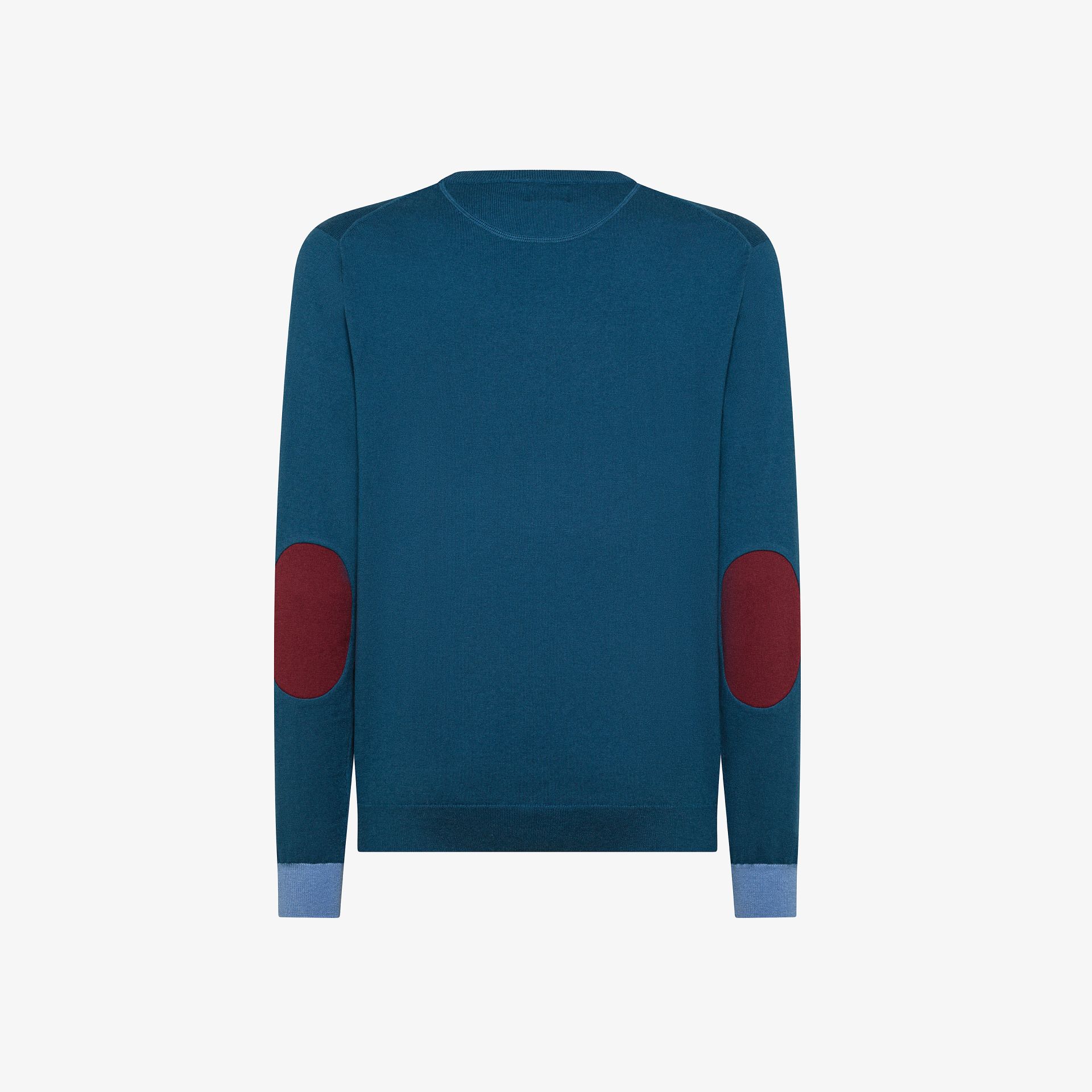 Girocollo misto lana e cotone con polsini e toppe sulle maniche in contrasto.