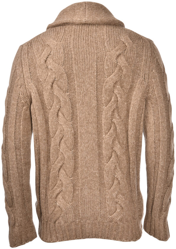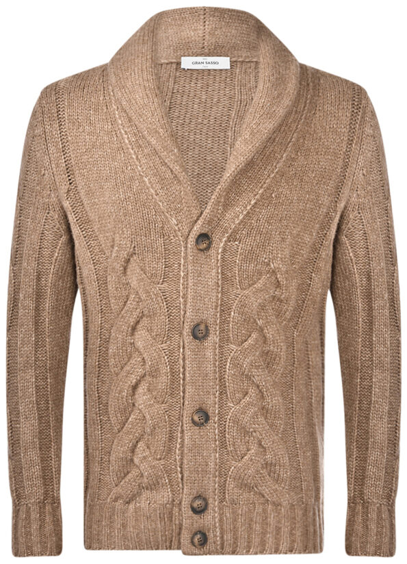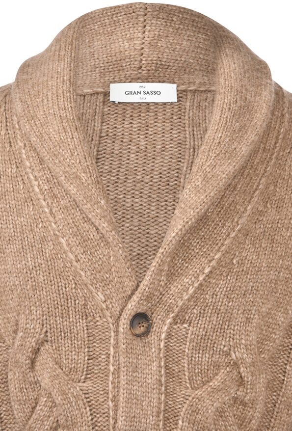 Cardigan con collo scialle caratterizzato da una pregiata lavorazione a trecce.