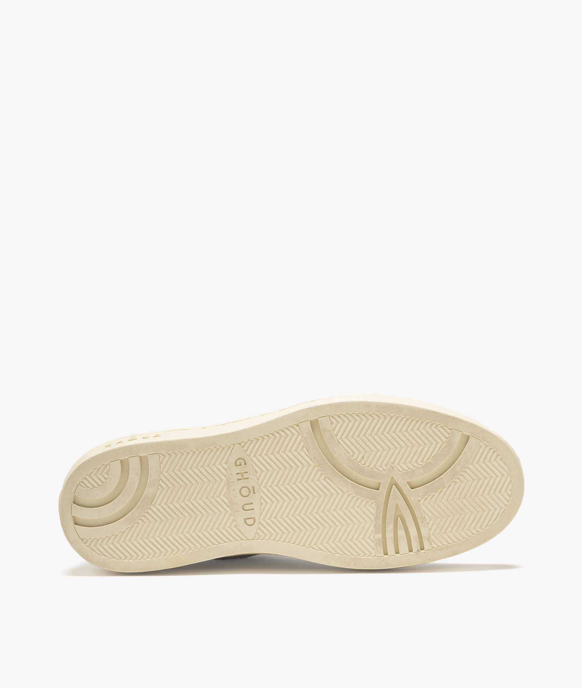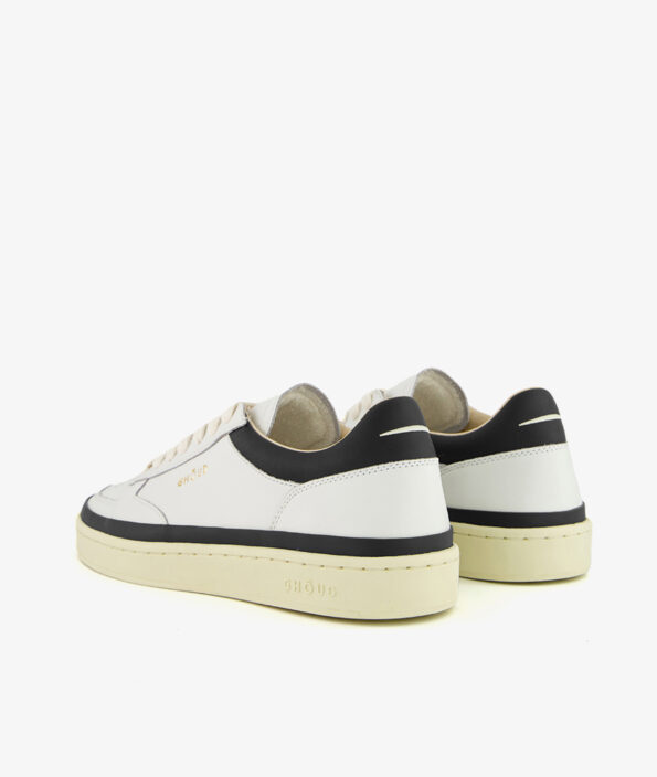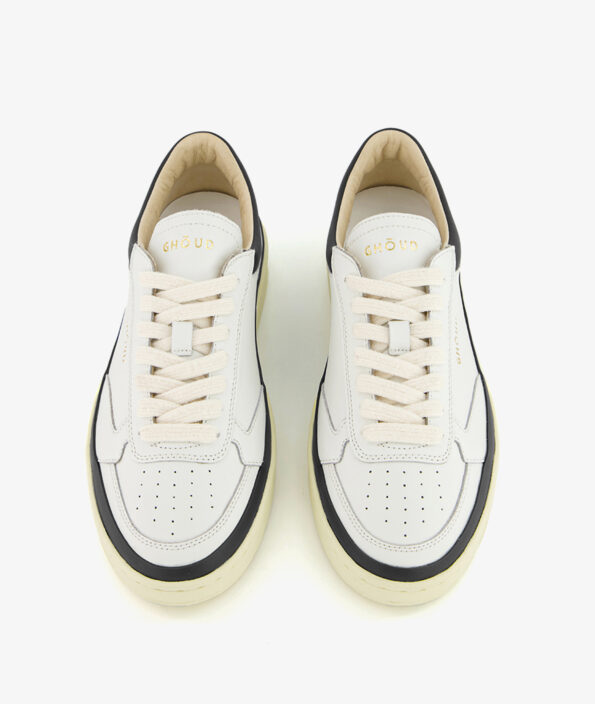 La silhouette elegante presenta una tomaia in morbida pelle bianca con dettagli di colore nero, impreziosita da una termosaldatura di precisione, lungo la suola, che ridefinisce il concetto di minimalismo.